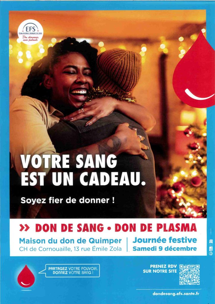 Don du sang le samedi 9 décembre à la maison du don a Quimper