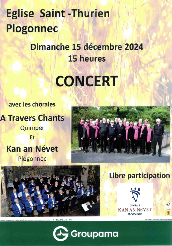 Concert de la chorale « Kan An Nevet » et « A travers Chants » le dimanche 15 décembre à partir de 15 heures à l’église Saint Thurien.