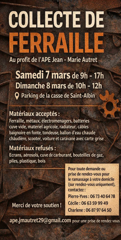 l’APE Jean Marie Autret de Saint Albin réitère sa collecte de ferraille. Cette année, l’opération se déroulera le samedi 7 mars de 9h à 17h00 et dimanche 8 mars de 10h à 12h sur le parking de la casse automobile de Saint Albin où des bennes seront présentes. Les bénéfices obtenus serviront à financer les projets de l’école (voyage scolaire, achat de matériels pour les enfants, …).
