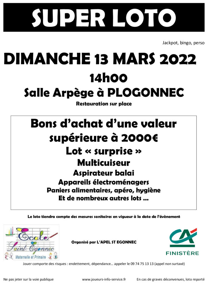 Super Loto le dimanche 13 mars 2022 à 14h00 à la salle de l’Arpège de Plogonnec
