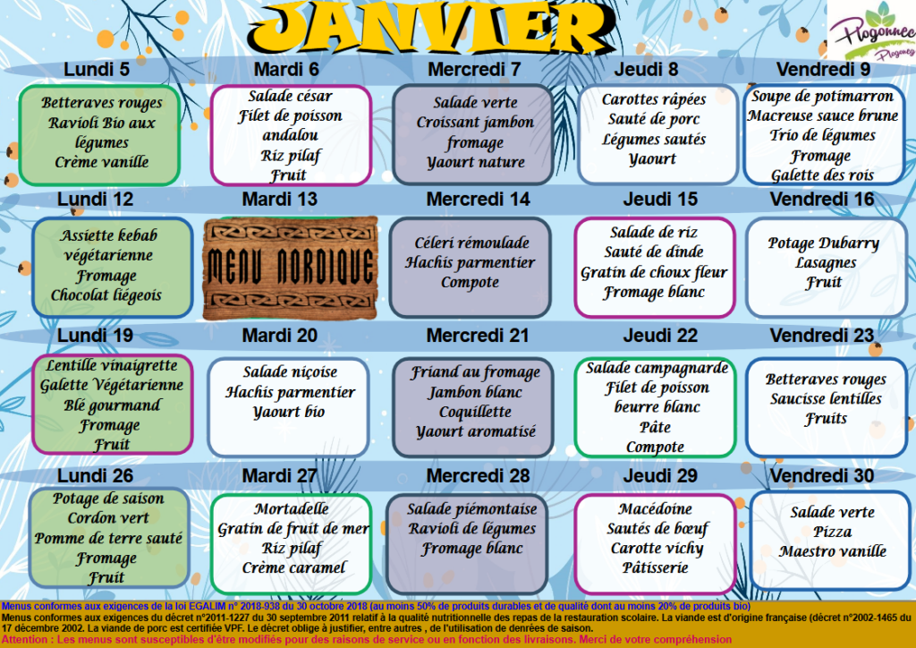 Menu du mois de Janvier 2026